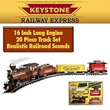 This is the most realistic train set you can find for your money. This oversized locomotive has lifelike sounds, a fully functional smokestack and even a working headlight beam. Features: Engine measures 16 inches in lengthWorking headlight beam Realistic railroad sounds Sound volume control switch Heavy die-cast engine and wheels Easy to assemble steel snap-fit track Smokestack that releases real smoke Caboose Freight car Tender car with removable load and side rails 20 piece track - 12 curved and 8 straight sections UL approved electric power pack Full color instruction sheet